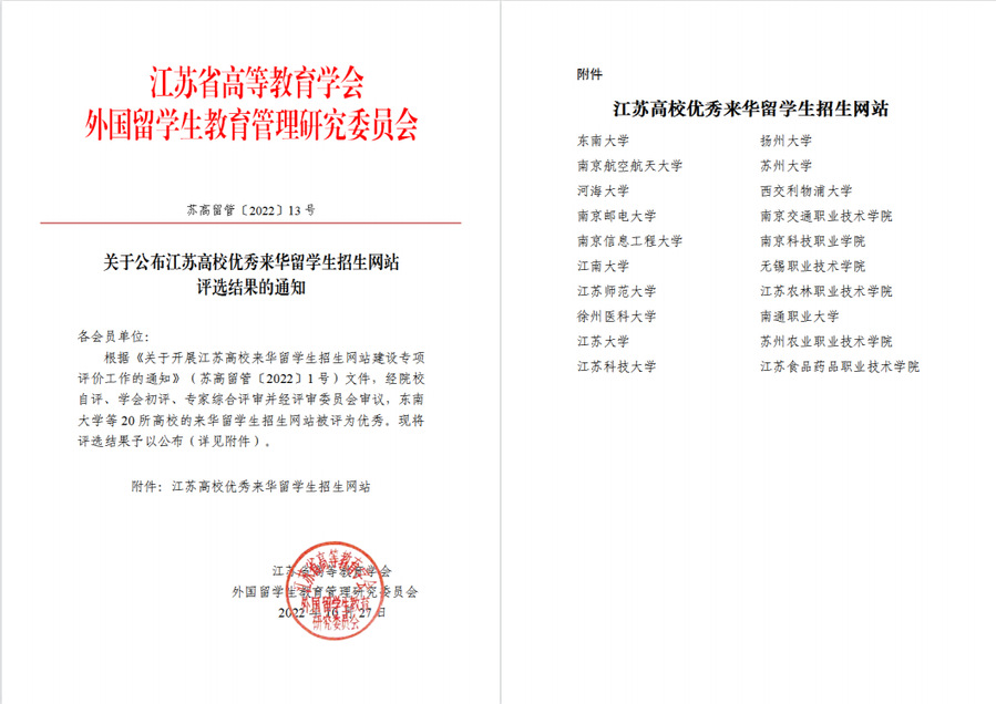 10月27日,江苏省高等教育学会外国留学生教育管理研究委员会公布了江苏高校优秀来华留学生招生网站评选结果,经过院校自评、学会初评、专家综合评审,并经评审委员会审议,我校来华留学生招生网站脱颖而出,被评选为优秀。此次评选全省共100多所高校参评,共20所高校的来华留学生招生网站被评选为优秀,其中高职院校7所,我校位列其中。