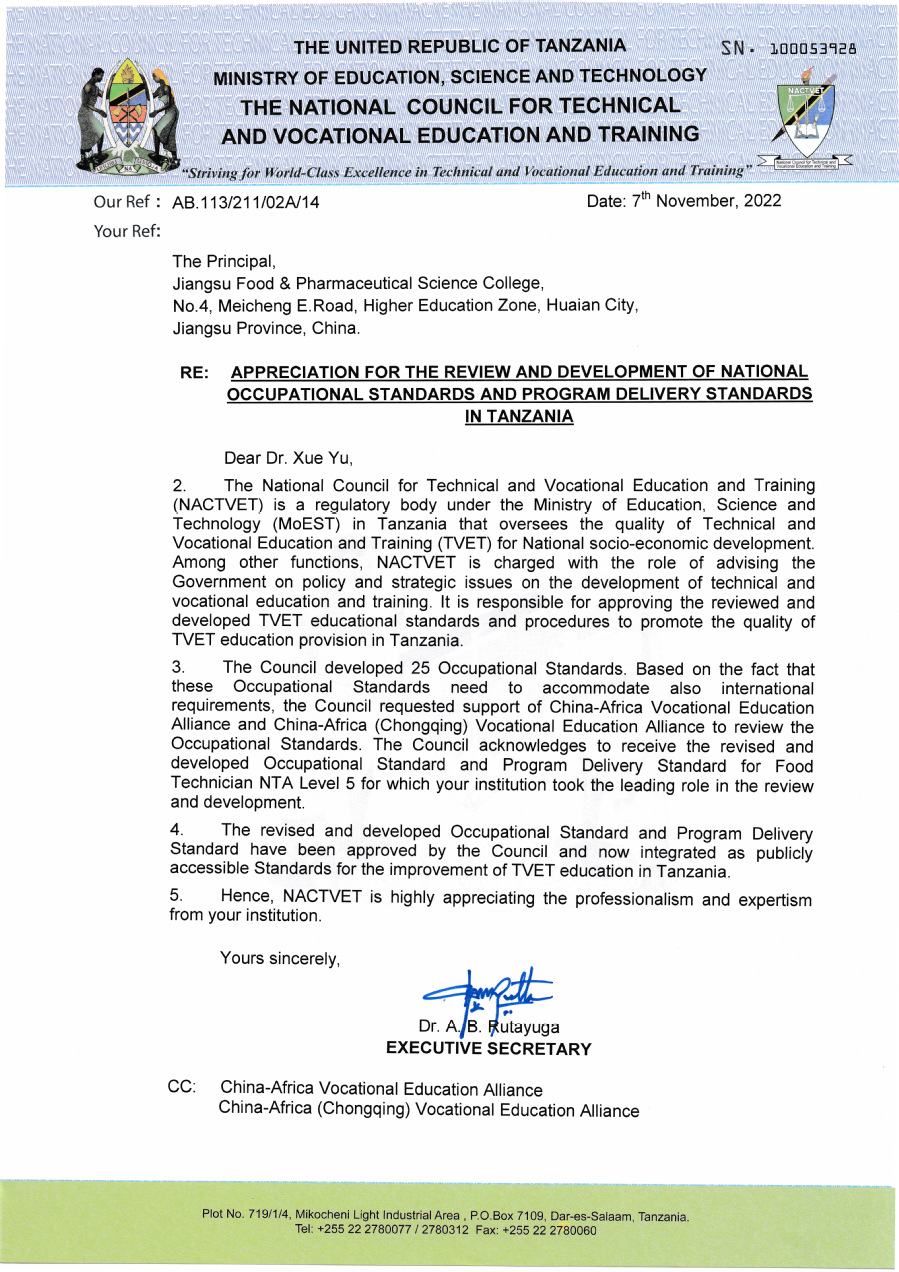 近日,我校第一批坦桑尼亚国家职业标准开发项目——食品技术员5级职业标准顺利通过坦桑尼亚国家职业教育委员会审核和认证,并正式纳入了坦桑尼亚国家职业教育体系。