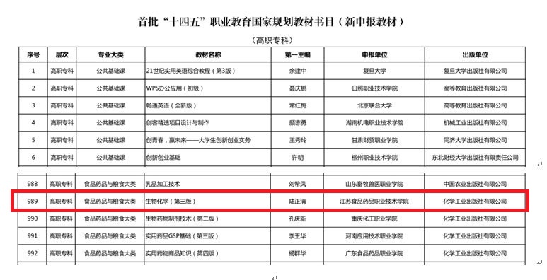 近日,据《教育部办公厅关于公布首批“十四五”职业教育国家规划教材书目的通知》(教职成厅函〔2023〕19号)获悉, 我校陆正清教授主编《生物与化学》(第三版)入选。本次遴选,经有关单位申报、形式审查、专家评审、专项审核、专家复核、面向社会公示等程序,共确定7251种教材入选,涵盖全部19个专业大类、1382个专业。
