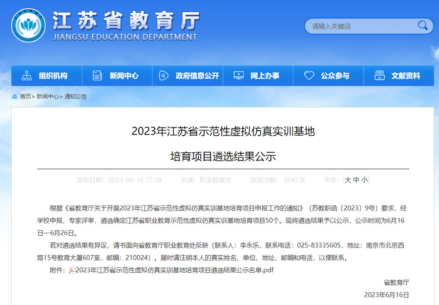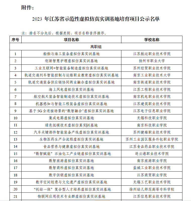 近日,根据《省教育厅关于开展2023年江苏省示范性虚拟仿真实训基地培育项目申报工作的通知》(苏教职函〔2023〕9号)文件要求,经学校申报、专家评审和结果公示,我校“食品营养与健康虚拟仿真实训基地”被确定江苏省职业教育示范性虚拟仿真实训基地培育项目,本次在省内高职院校共遴选了40个项目。