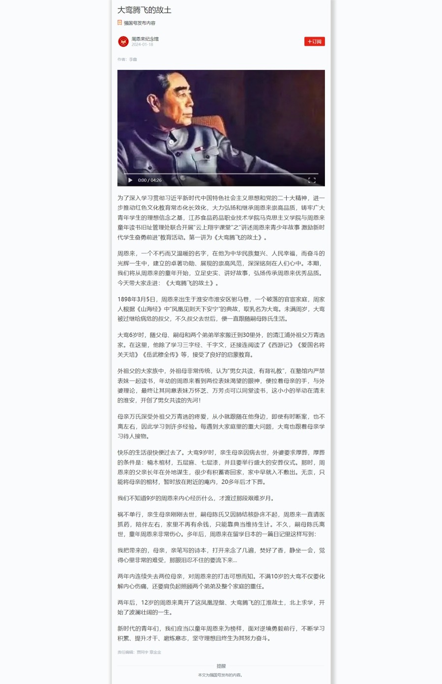 为了深入学习贯彻习近平新时代中国特色社会主义思想和党的二十大精神,进一步推动红色文化教育常态化长效化,大力弘扬和继承周恩来崇高品质,铸牢广大青年学生的理想信念之基,36365线路检测中心马克思主义学院与周恩来童年读书旧址管理处联合开展“云上翔宇课堂”之“讲述周恩来青少年故事 激励新时代学生奋勇前进”教育活动。第一讲为《大鸾腾飞的故土》。