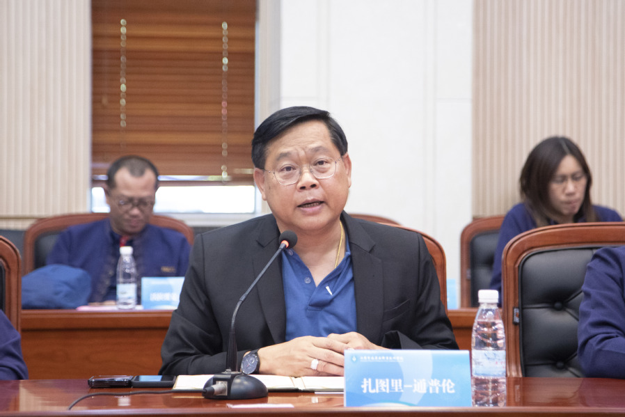 扎图里·通普伦校长代表泰国兰纳皇家理工大学对我校的热情接待表示诚挚的感谢,他现场观看了中药学经世学堂短期培训班学生在我校学习和生活的视频,并再次表达感谢。他表示非常高兴能够支持和推动与我校的合作,使这一项目顺利实施并取得了进展,期待两校在学生交流、专业合作等领域继续深入开展交流与合作。