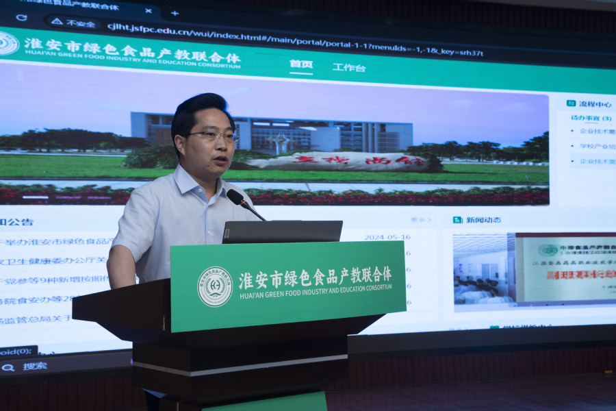 薛宇致欢迎词,他首先向出席大会的领导嘉宾、业界同仁表示诚挚的欢迎和衷心的感谢,强调产业发展需要扎扎实实,教育事业也需要“接地气”,希望本次对接会的举办可以落地见效,更好服务发展新质生产力,推进以教促产、以产助教,构建“产业赋能教育、教育培养人才、人才支撑产业”的产教融合循环生态链,推动淮安市绿色食品产业高质量发展。